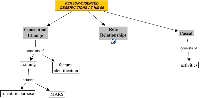Den här kartan innehåller information om: Person-Oriented Observations at HM-99, Conceptual Change consists of framing, framing includes scientific purpose, Pascal consists of activities, Conceptual Change consists of feature identification, framing includes MARS