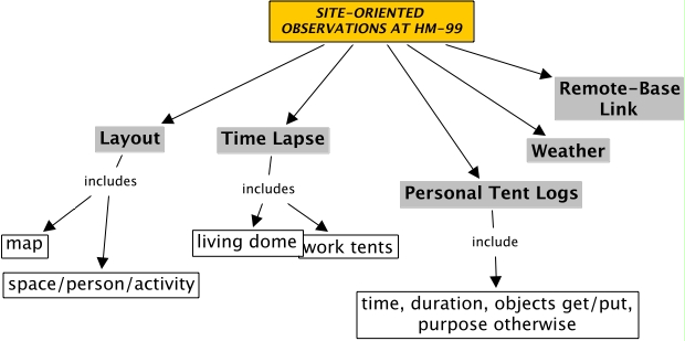 Site-Oriented Observations at HM-99, Time Lapse includes work tents, Personal Tent Logs include time, duration, objects get/put, purpose otherwise, Layout includes space/person/activity, Layout includes map, Time Lapse includes living dome