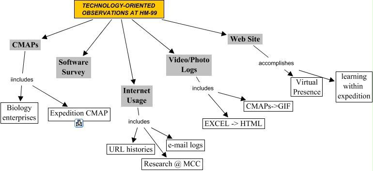 Den här kartan innehåller information om: Technology-Oriented Record at HM-99, Internet Usage includes e-mail logs, CMAPs iincludes Biology enterprises, Video/Photo Logs includes CMAPs->GIF, Web Site accomplishes learning within expedition, Internet Usage includes URL histories, Video/Photo Logs includes EXCEL -> HTML, Internet Usage includes Research @ MCC, CMAPs iincludes Expedition CMAP, Web Site accomplishes Virtual Presence