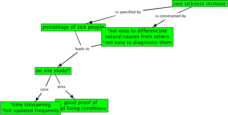 sickness map, rare sickness increase is constrained by *not easy to differenciate natural causes from others *not easy to diagnostic them, on site study!! pros good proof of bad living conditions, rare sickness increase is specified by percentage of sick people, percentage of sick people leads to on site study!!, *not easy to differenciate natural causes from others *not easy to diagnostic them leads to on site study!!, on site study!! cons *time consuming *not updated frequently