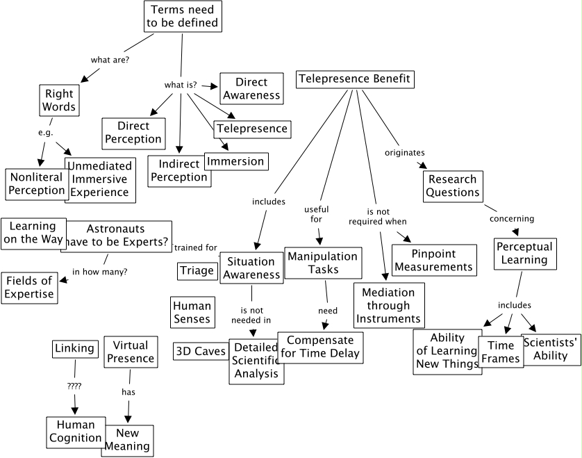 telepresence, Perceptual Learning includes Scientists' Ability, Astronauts have to be Experts? trained for Situation Awareness, Manipulation Tasks need Compensate for Time Delay, Telepresence Benefit originates Research Questions, Terms need to be defined what are? Right Words, Telepresence Benefit is not required when Pinpoint Measurements, Terms need to be defined what is? Indirect Perception, Terms need to be defined what is? Immersion, Astronauts have to be Experts? in how many? Fields of Expertise, Research Questions concerning Perceptual Learning