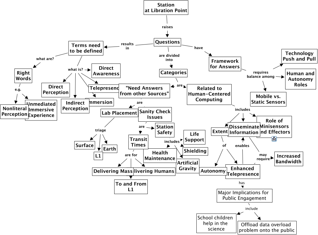OrbitLibrationGroup, Terms need to be defined what are? Right Words, Sanity Check Issues are Transit Times, Extent of Autonomy, Lab Placement triage Surface, Questions are divided into Categories, Framework for Answers requires balance among Mobile vs. Static Sensors, Extent of Enhanced Telepresence, Related to Human-Centered Computing includes Role of Minisensors and Effectors, Enhanced Telepresence may require Increased Bandwidth, Terms need to be defined what is? Indirect Perception