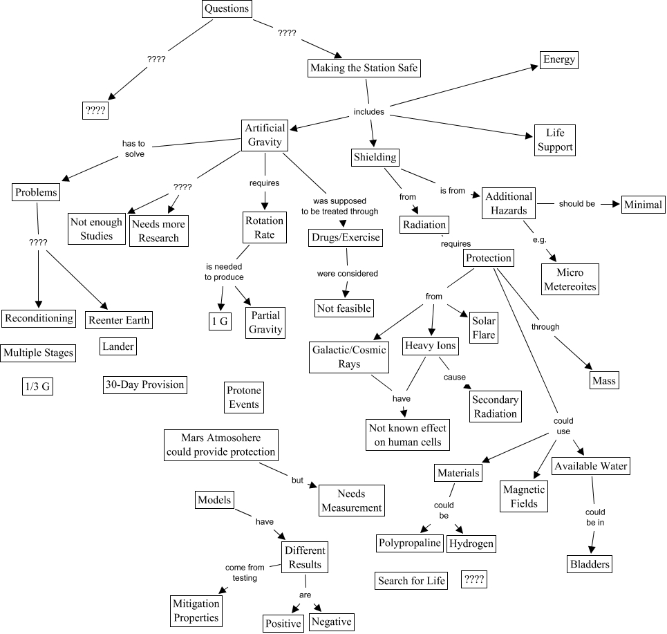 Esse mapa conceitual, produzido no IHMC CmapTools, tem a informação relacionada a: Safety, Different Results come from testing Mitigation Properties, Making the Station Safe includes Artificial Gravity, Additional Hazards e.g. Micro Metereoites, Making the Station Safe includes Shielding, Artificial Gravity has to solve Problems, Protection from Heavy Ions, Radiation requires Protection, Making the Station Safe includes Energy, Questions ???? Making the Station Safe, Additional Hazards should be Minimal, Protection from Solar Flare, Making the Station Safe includes Life Support, Problems ???? Reenter Earth, Materials could be Hydrogen, Shielding is from Additional Hazards, Protection from Galactic/Cosmic Rays, Models have Different Results, Protection through Mass, Protection could use Magnetic Fields, Different Results are Negative