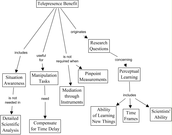 Esse mapa conceitual, produzido no IHMC CmapTools, tem a informação relacionada a: telepresencebenefits, Perceptual Learning includes Time Frames, Perceptual Learning includes Ability of Learning New Things, Telepresence Benefit is not required when Pinpoint Measurements, Research Questions concerning Perceptual Learning, Manipulation Tasks need Compensate for Time Delay, Telepresence Benefit is not required when Mediation through Instruments, Telepresence Benefit useful for Manipulation Tasks, Telepresence Benefit includes Situation Awareness, Perceptual Learning includes Scientists' Ability, Telepresence Benefit originates Research Questions, Situation Awareness is not needed in Detailed Scientific Analysis