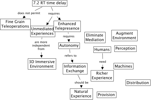 timedelay, Humans need Richer Experience, Enhanced Telepresence requires Autonomy, Autonomy refers to Information Exchange, Information Exchange should be Natural Experience, 7.2 RT time delay does not permit Fine Grain Teleoperations, 7.2 RT time delay requires Enhanced Telepresence, 7.2 RT time delay requires Unmediated Experiences, Unmediated Experiences are more independent from 3D Immersive Environment
