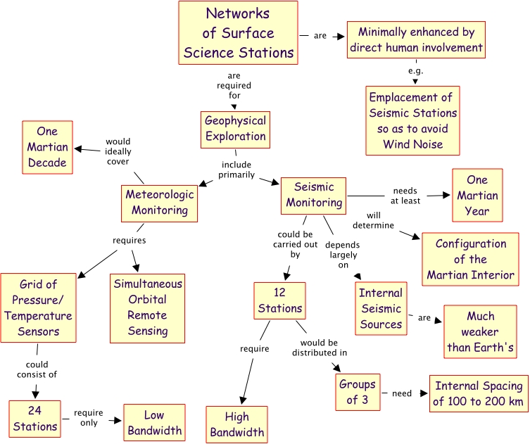 Network Science, 12 Stations require High Bandwidth, Meteorologic Monitoring requires Grid of Pressure/ Temperature Sensors, Seismic Monitoring will determine Configuration of the Martian Interior, Networks of Surface Science Stations are required for Geophysical Exploration, Seismic Monitoring depends largely on Internal Seismic Sources, Groups of 3 need Internal Spacing of 100 to 200 km, Meteorologic Monitoring requires Simultaneous Orbital Remote Sensing, 24 Stations require only Low Bandwidth, Geophysical Exploration include primarily Seismic Monitoring, Grid of Pressure/ Temperature Sensors could consist of 24 Stations