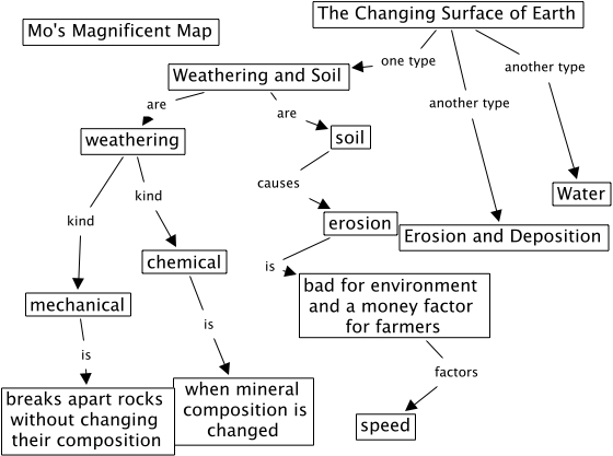 Mo 1, chemical is when mineral composition is changed, weathering kind chemical, bad for environment and a money factor for farmers factors speed, weathering kind mechanical, mechanical is breaks apart rocks without changing their composition, The Changing Surface of Earth one type Weathering and Soil, Weathering and Soil are soil, soil causes erosion, The Changing Surface of Earth another type Water, Weathering and Soil are weathering