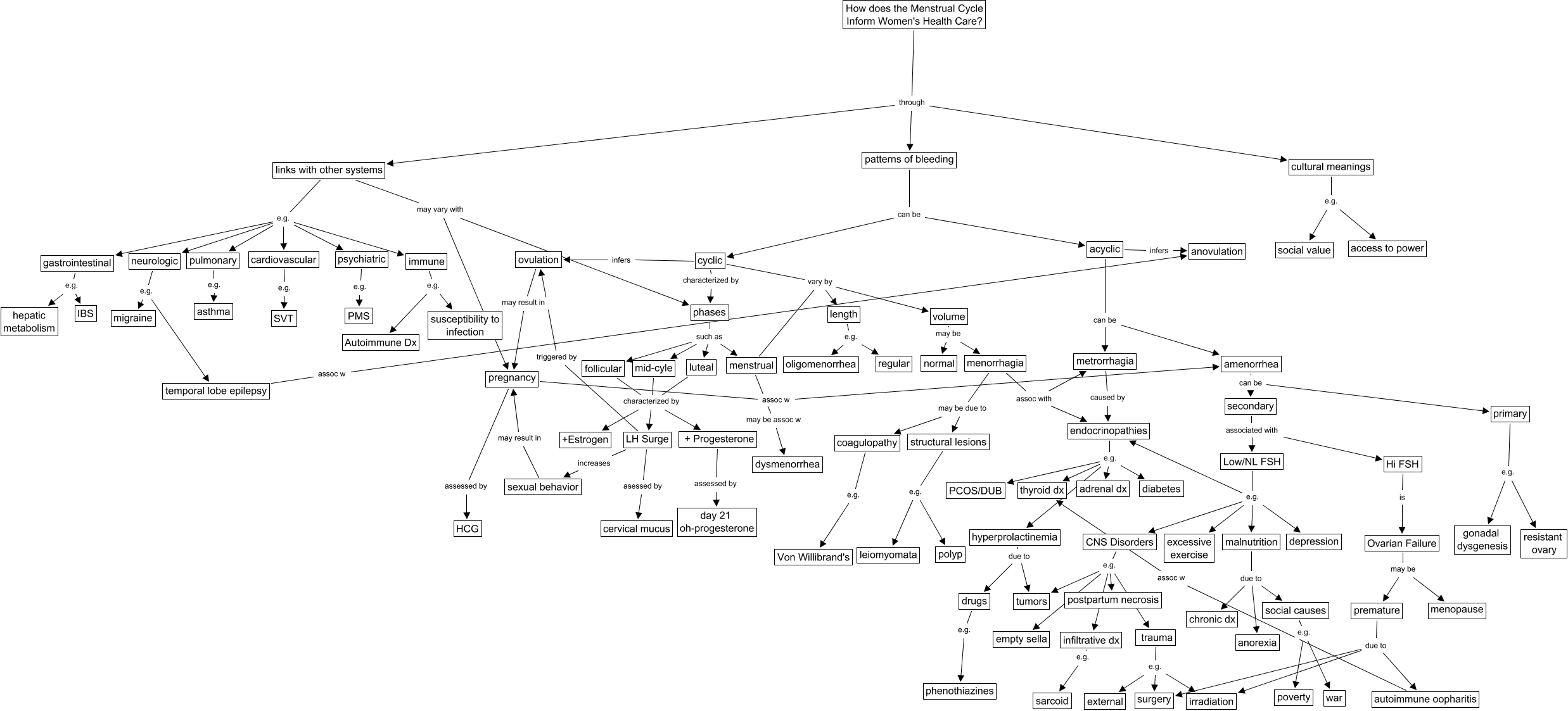 Cette carte conceptuelle, cree avec IHMC CmapTools, contient des informations liees a : menstrual_cycle_emh_8_31, menorrhagia may be due to structural lesions, LH Surge increases sexual behavior, How does the Menstrual Cycle Inform Women's Health Care? through patterns of bleeding, phases such as mid-cyle, psychiatric e.g. PMS, trauma e.g. surgery, malnutrition due to chronic dx, links with other systems e.g. psychiatric, pregnancy assoc w amenorrhea, phases such as menstrual, mid-cyle characterized by +Estrogen, neurologic e.g. temporal lobe epilepsy, primary e.g. resistant ovary, LH Surge triggered by ovulation, length e.g. oligomenorrhea, cyclic infers ovulation, Hi FSH is Ovarian Failure, sexual behavior may result in pregnancy, acyclic infers anovulation, social causes e.g. poverty