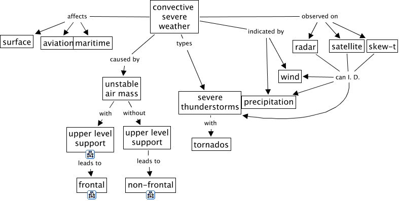 This Concept Map, created with IHMC CmapTools, has information related to: ConvectiveSevereWeather, radar can I. D. severe thunderstorms, convective severe weather affects maritime, convective severe weather affects aviation, satellite can I. D. severe thunderstorms, convective severe weather observed on satellite, convective severe weather indicated by precipitation, unstable air mass with upper level support, convective severe weather affects surface, radar can I. D. wind, convective severe weather indicated by wind, upper level support leads to non-frontal, unstable air mass without upper level support, skew-t can I. D. severe thunderstorms, radar can I. D. precipitation, convective severe weather caused by unstable air mass, skew-t can I. D. precipitation, convective severe weather types severe thunderstorms, convective severe weather observed on skew-t, severe thunderstorms with tornados, satellite can I. D. wind