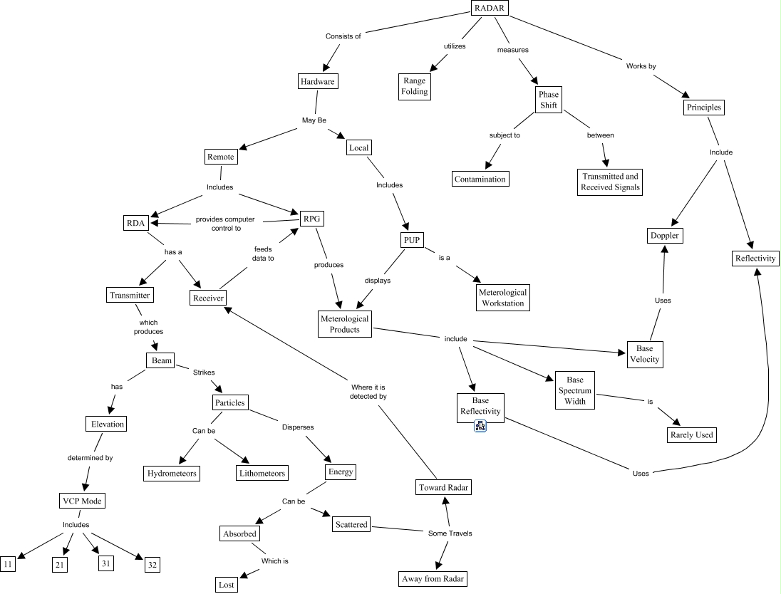 Este Cmap, tiene información relacionada con: RADAR, Remote Includes RPG, PUP displays Meterological Products, Remote Includes RDA, Local Includes PUP, Beam Strikes Particles, Meterological Products include Base Reflectivity, RADAR Works by Principles, Hardware May Be Remote, Meterological Products include Base Spectrum Width, Hardware May Be Local, Elevation determined by VCP Mode, VCP Mode Includes 31, RDA has a Receiver, Particles Can be Lithometeors, RPG produces Meterological Products, RADAR measures Phase Shift, Toward Radar Where it is detected by Receiver, Base Reflectivity Uses Reflectivity, Energy Can be Scattered, Scattered Some Travels Away from Radar