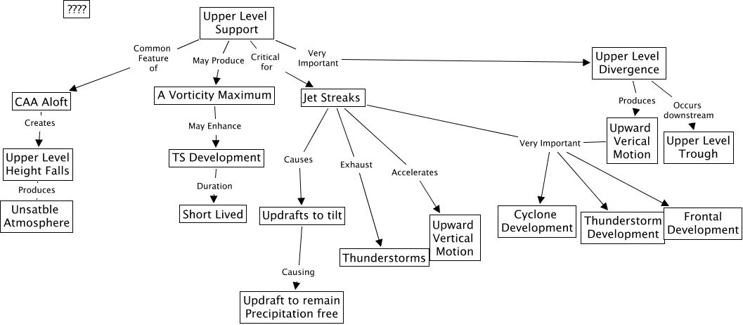 This Concept Map, created with IHMC CmapTools, has information related to: UpperLevelSupport, Upper Level Support Critical for Jet Streaks, Jet Streaks Very Important Cyclone Development, CAA Aloft Creates Upper Level Height Falls, TS Development Duration Short Lived, Upper Level Support Very Important Upper Level Divergence, Upward Verical Motion Very Important Cyclone Development, Jet Streaks Causes Updrafts to tilt, Jet Streaks Exhaust Thunderstorms, Upper Level Support Common Feature of CAA Aloft, Jet Streaks Very Important Thunderstorm Development, Updrafts to tilt Causing Updraft to remain Precipitation free, Upward Verical Motion Very Important Frontal Development, Upper Level Divergence Occurs downstream Upper Level Trough, Upper Level Divergence Produces Upward Verical Motion, Upward Verical Motion Very Important Thunderstorm Development, A Vorticity Maximum May Enhance TS Development, Upper Level Height Falls Produces Unsatble Atmosphere, Jet Streaks Very Important Frontal Development, Upper Level Support May Produce A Vorticity Maximum, Jet Streaks Accelerates Upward Vertical Motion