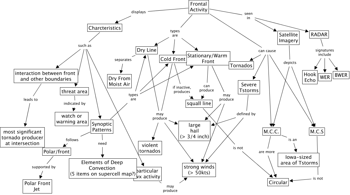This Concept Map, created with IHMC CmapTools, has information related to: FrontalActivity, M.C.C. is an Iowa-sized area of Tstorms, Severe Tstorms defined by strong winds (> 50kts), Synoptic Patterns types are Stationary/Warm Front, Charcteristics such as Synoptic Patterns, Synoptic Patterns need Elements of Deep Convection (5 items on supercell map?), threat area indicated by watch or warning area, Frontal Activity types are Cold Front, Frontal Activity seen in Satellite Imagery, Synoptic Patterns follows Polar/front, RADAR signatures include BWER, Cold Front may produce strong winds (> 50kts), RADAR signatures include Hook Echo, Frontal Activity can cause M.C.S, Frontal Activity types are Stationary/Warm Front, M.C.S is not Circular, particular wx activity may produce strong winds (> 50kts), Cold Front if inactive, produces squall line, Frontal Activity can cause Severe Tstorms, Frontal Activity displays Charcteristics, Cold Front may produce violent tornados