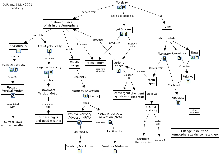 This Concept Map, created with IHMC CmapTools, has information related to: Vorticity DePalma 04 May 2000, earth spin causes coriolis effect, Rotation of units of air in the Atmosphere influences jet maximum, Rotation of units of air in the Atmosphere can rotate Cyclonically, Vorticity Advection types Negative Vorticity Advection (NVA), Types which Include Planetary, Cyclonically same as Positive Vorticity, earth spin produces positive vorticity, positive vorticity varies with latitude, Relative Combined Absolute, Vorticity has Types, positive vorticity in Northern Hemisphers, Planetary derives from earth spin, Curvature Combined Relative, Rotation of units of air in the Atmosphere which moves energy, Types which Include Shear, Vorticity may be produced by Jet Stream, Vorticity Advection types Positive Vorticity Advection (PVA), Types which Include Curvature, Jet Stream interacts with coriolis effect, Positive Vorticity Advection (PVA) Identified by Vorticity Maximum