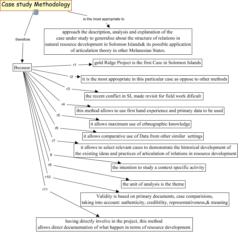 Este Cmap, tiene información relacionada con: methodology, Because r10 Validity is based on primary documents, case comparisions, taking into account: authenticity, credibility, representativeness,& meaning, Because r2 it is the most appropriate in this particular case as oppose to other methods, Because 8 the intention to study a context specific activity, Because r3 the recent conflict in SI, made revisit for field work dificult, Because r1 gold Ridge Project is the first Case in Solomon Islands, Because r5 it allows maximum use of ethnographic knowledge, Because r7 it allows to select relevant cases to demonstrate the historical development of the existing ideas and practices of articulation of relations in resource development, Because r11 having directly involve in the project, this method allows direct documentation of what happen in terms of resource development., Case study Methodology therefore Because, Because r4 this method allows to use first hand experience and primary data to be used, Because r6 it allows comparative use of Data from other similar settings, Case study Methodology is the most appropriate to approach the description, analysis and explanation of the case under study to generalise about the structure of relations in natural resource development in Solomon Islands& its possible application of articulation theory in other Melanesian States., Because r9 the unit of analysis is the theme