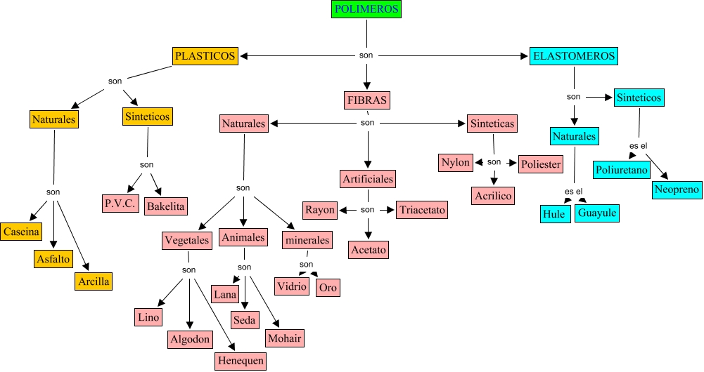 Este Cmap, tiene información relacionada con: polimeros, Naturales son minerales, PLASTICOS son Naturales, Sinteticas son Poliester, minerales son Vidrio, PLASTICOS son Sinteticos, POLIMEROS son PLASTICOS, Artificiales son Acetato, ELASTOMEROS son Naturales, Sinteticos es el Poliuretano, Naturales son Vegetales, Sinteticos son P.V.C., Naturales son Caseina, ELASTOMEROS son Sinteticos, Naturales son Animales, Artificiales son Rayon, Animales son Lana, Vegetales son Lino, POLIMEROS son ELASTOMEROS, FIBRAS son Naturales, Artificiales son Triacetato