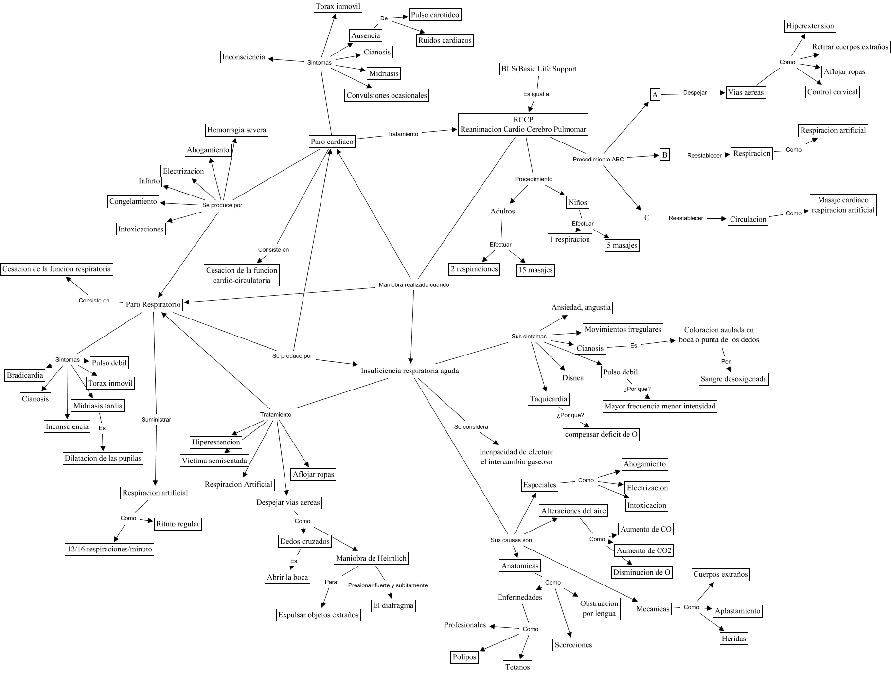 Este Cmap, tiene información relacionada con: Reanimacion cardio cerebro pulmonar, Vias aereas Como Control cervical, Paro cardiaco Se produce por Intoxicaciones, Ausencia De Pulso carotideo, Pulso debil ¿Por que? Mayor frecuencia menor intensidad, Adultos Efectuar 2 respiraciones, Mecanicas Como Cuerpos extraños, Especiales Como Ahogamiento, C Reestablecer Circulacion, Alteraciones del aire Como Aumento de CO2, Insuficiencia respiratoria aguda Sus sintomas Movimientos irregulares, Insuficiencia respiratoria aguda Sus sintomas Pulso debil, Enfermedades Como Profesionales, RCCP Reanimacion Cardio Cerebro Pulmomar Procedimiento ABC C, Taquicardia ¿Por que? compensar deficit de O, B Reestablecer Respiracion, Insuficiencia respiratoria aguda Tratamiento Aflojar ropas, RCCP Reanimacion Cardio Cerebro Pulmomar Maniobra realizada cuando Paro cardiaco, Paro Respiratorio Sintomas Bradicardia, Paro Respiratorio Sintomas Midriasis tardia, Respiracion artificial Como 12/16 respiraciones/minuto