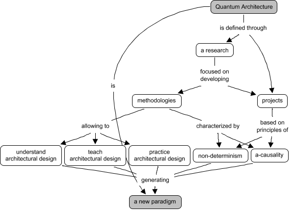 Este mapa conceptual tiene información relacionada a: Quantum architecture, non-determinism generating a new paradigm, projects based on principles of a-causality, a research focused on developing projects, Quantum Architecture is defined through projects, methodologies allowing to practice architectural design, Quantum Architecture is a new paradigm, a research focused on developing methodologies, a-causality generating a new paradigm, methodologies allowing to understand architectural design, Quantum Architecture is defined through a research, teach architectural design generating a new paradigm, projects based on principles of non-determinism, practice architectural design generating a new paradigm, methodologies characterized by a-causality, methodologies characterized by non-determinism, understand architectural design generating a new paradigm, methodologies allowing to teach architectural design