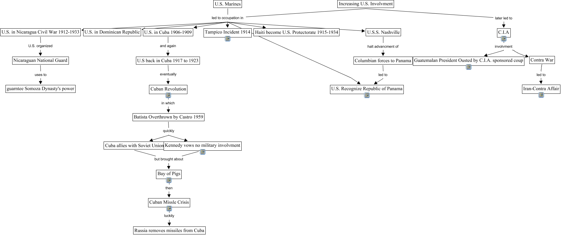 Este Cmap, tiene información relacionada con: U.S. in Latin America_ WWII into the Cold War, Cuban Revolution in which Batista Overthrown by Castro 1959, Cuba allies with Soviet Union but brought about Bay of Pigs, Increasing U.S. Involvment led to occupation in U.S. in Dominican Republic, Cuban Missle Crisis luckily Russia removes missiles from Cuba, Contra War led to Iran-Contra Affair, Kennedy vows no military involvment but brought about Bay of Pigs, Columbian forces to Panama led to U.S. Recognize Republic of Panama, U.S.S. Nashville halt advancment of Columbian forces to Panama, Increasing U.S. Involvment led to occupation in U.S. in Nicaragua Civil War 1912-1933, Increasing U.S. Involvment led to occupation in U.S. Recognize Republic of Panama, U.S. Marines led to occupation in U.S. in Nicaragua Civil War 1912-1933, Increasing U.S. Involvment later led to C.I.A, Increasing U.S. Involvment led to occupation in U.S. in Cuba 1906-1909, U.S. Marines led to occupation in U.S. in Cuba 1906-1909, U.S. Marines led to occupation in Haiti become U.S. Protectorate 1915-1934, U.S. Marines led to occupation in Tampico Incident 1914, U.S. in Cuba 1906-1909 and again U.S back in Cuba 1917 to 1923, Batista Overthrown by Castro 1959 quickly Cuba allies with Soviet Union, U.S back in Cuba 1917 to 1923 eventually Cuban Revolution, C.I.A involvment Guatemalan President Ousted by C.I.A. sponsored coup