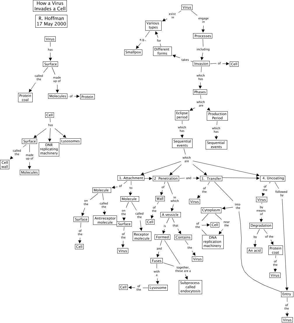 This Concept Map, created with IHMC CmapTools, has information related to: Hoffman's map, Entry of the Virus, A vessicle is Formed, Cell has Surface, Cytoplasm near the DNA replication machinery, Virus exist in Various types, Invasion which has Phases, Degradation by An acid, Virus engage in Processes, Sequential events which are 1. Attachment, Different forms for Various types, Sequential events which are 2 Penetration, Wall of the Cell, 4. Uncoating followed by Entry, Contains the Virus, 2 Penetration in which A vessicle, Surface called the Protein coal, Surface made up of Molecules, Virus has Surface, Molecule called the Receptor molecule, 3. Transfer of the Virus