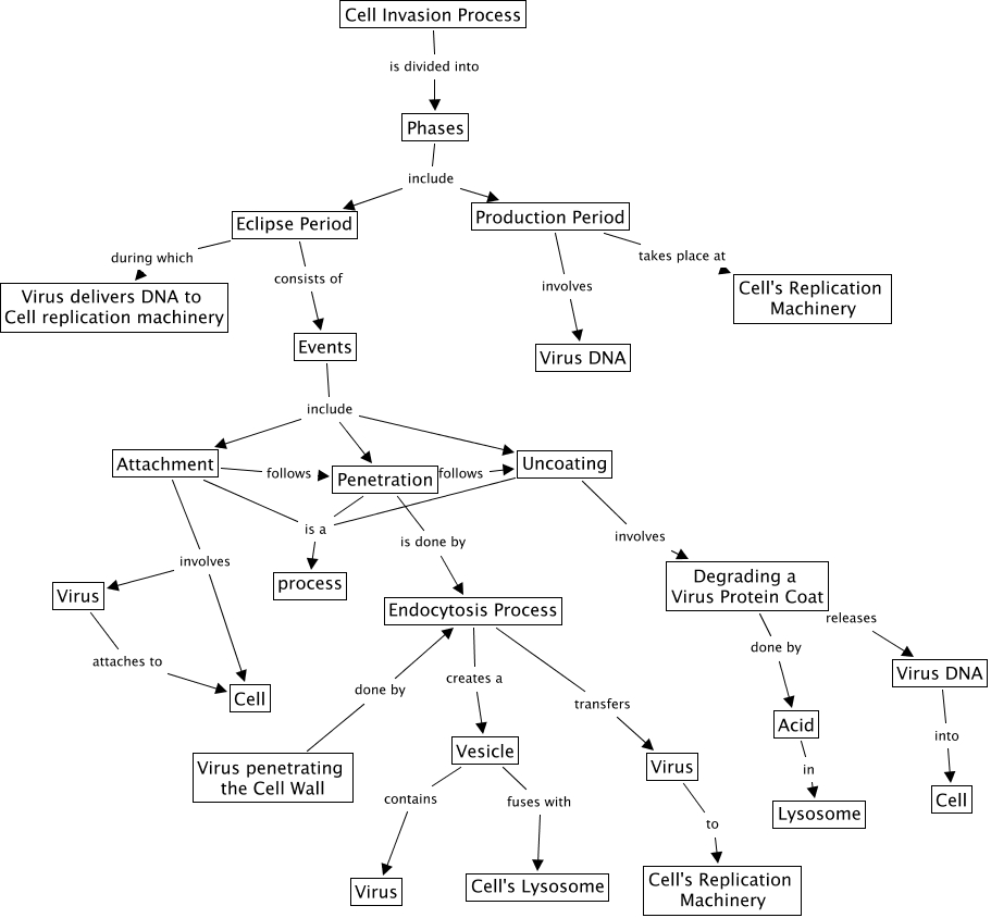 This Concept Map, created with IHMC CmapTools, has information related to: Cell Invasion Process (second draft), Degrading a Virus Protein Coat done by Acid, Production Period involves Virus DNA, Vesicle fuses with Cell's Lysosome, Endocytosis Process transfers Virus, Uncoating is a process, Virus DNA into Cell, Phases include Eclipse Period, Virus penetrating the Cell Wall done by Endocytosis Process, Degrading a Virus Protein Coat releases Virus DNA, Phases include Production Period, Attachment follows Penetration, Events include Attachment, Attachment involves Virus, Eclipse Period during which Virus delivers DNA to Cell replication machinery, Attachment is a process, Vesicle contains Virus, Endocytosis Process creates a Vesicle, Events include Uncoating, Attachment involves Cell, Uncoating involves Degrading a Virus Protein Coat