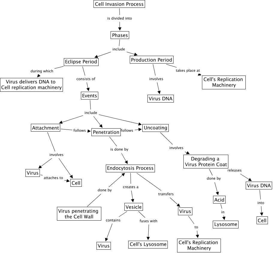 This Concept Map, created with IHMC CmapTools, has information related to: Cell Invasion Process (first draft), Virus attaches to Cell, Virus to Cell's Replication Machinery, Events include Uncoating, Attachment involves Virus, Acid in Lysosome, Endocytosis Process creates a Vesicle, Production Period involves Virus DNA, Cell Invasion Process is divided into Phases, Phases include Production Period, Vesicle fuses with Cell's Lysosome, Eclipse Period during which Virus delivers DNA to Cell replication machinery, Endocytosis Process transfers Virus, Degrading a Virus Protein Coat releases Virus DNA, Production Period takes place at Cell's Replication Machinery, Eclipse Period consists of Events, Vesicle contains Virus, Penetration follows Uncoating, Degrading a Virus Protein Coat done by Acid, Events include Penetration, Penetration is done by Endocytosis Process