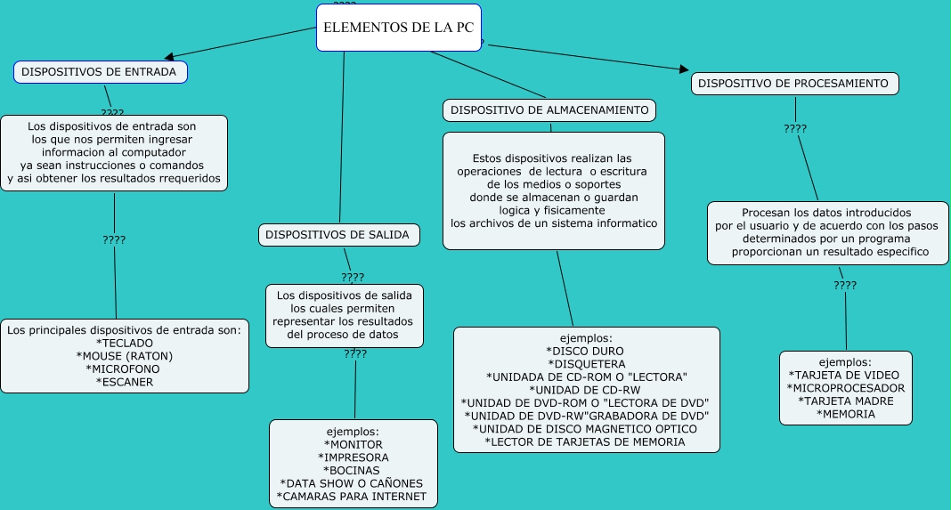 Este Cmap, tiene información relacionada con: Ravazzini, ELEMENTOS DE LA PC ???? DISPOSITIVOS DE SALIDA, ELEMENTOS DE LA PC ???? DISPOSITIVO DE PROCESAMIENTO, Los dispositivos de entrada son los que nos permiten ingresar informacion al computador ya sean instrucciones o comandos y asi obtener los resultados rrequeridos ???? ????, DISPOSITIVO DE PROCESAMIENTO ???? Procesan los datos introducidos por el usuario y de acuerdo con los pasos determinados por un programa proporcionan un resultado especifico, DISPOSITIVOS DE SALIDA ???? Los dispositivos de salida los cuales permiten representar los resultados del proceso de datos, ELEMENTOS DE LA PC ???? DISPOSITIVO DE ALMACENAMIENTO, DISPOSITIVO DE ALMACENAMIENTO ???? Estos dispositivos realizan las operaciones de lectura o escritura de los medios o soportes donde se almacenan o guardan logica y fisicamente los archivos de un sistema informatico, Procesan los datos introducidos por el usuario y de acuerdo con los pasos determinados por un programa proporcionan un resultado especifico ???? ejemplos: *TARJETA DE VIDEO *MICROPROCESADOR *TARJETA MADRE *MEMORIA, Estos dispositivos realizan las operaciones de lectura o escritura de los medios o soportes donde se almacenan o guardan logica y fisicamente los archivos de un sistema informatico ???? ejemplos: *DISCO DURO *DISQUETERA *UNIDADA DE CD-ROM O "LECTORA" *UNIDAD DE CD-RW *UNIDAD DE DVD-ROM O "LECTORA DE DVD" *UNIDAD DE DVD-RW"GRABADORA DE DVD" *UNIDAD DE DISCO MAGNETICO OPTICO *LECTOR DE TARJETAS DE MEMORIA, ELEMENTOS DE LA PC ???? DISPOSITIVOS DE ENTRADA, DISPOSITIVOS DE ENTRADA ???? Los dispositivos de entrada son los que nos permiten ingresar informacion al computador ya sean instrucciones o comandos y asi obtener los resultados rrequeridos, Los dispositivos de salida los cuales permiten representar los resultados del proceso de datos ???? ejemplos: *MONITOR *IMPRESORA *BOCINAS *DATA SHOW O CAÑONES *CAMARAS PARA INTERNET
