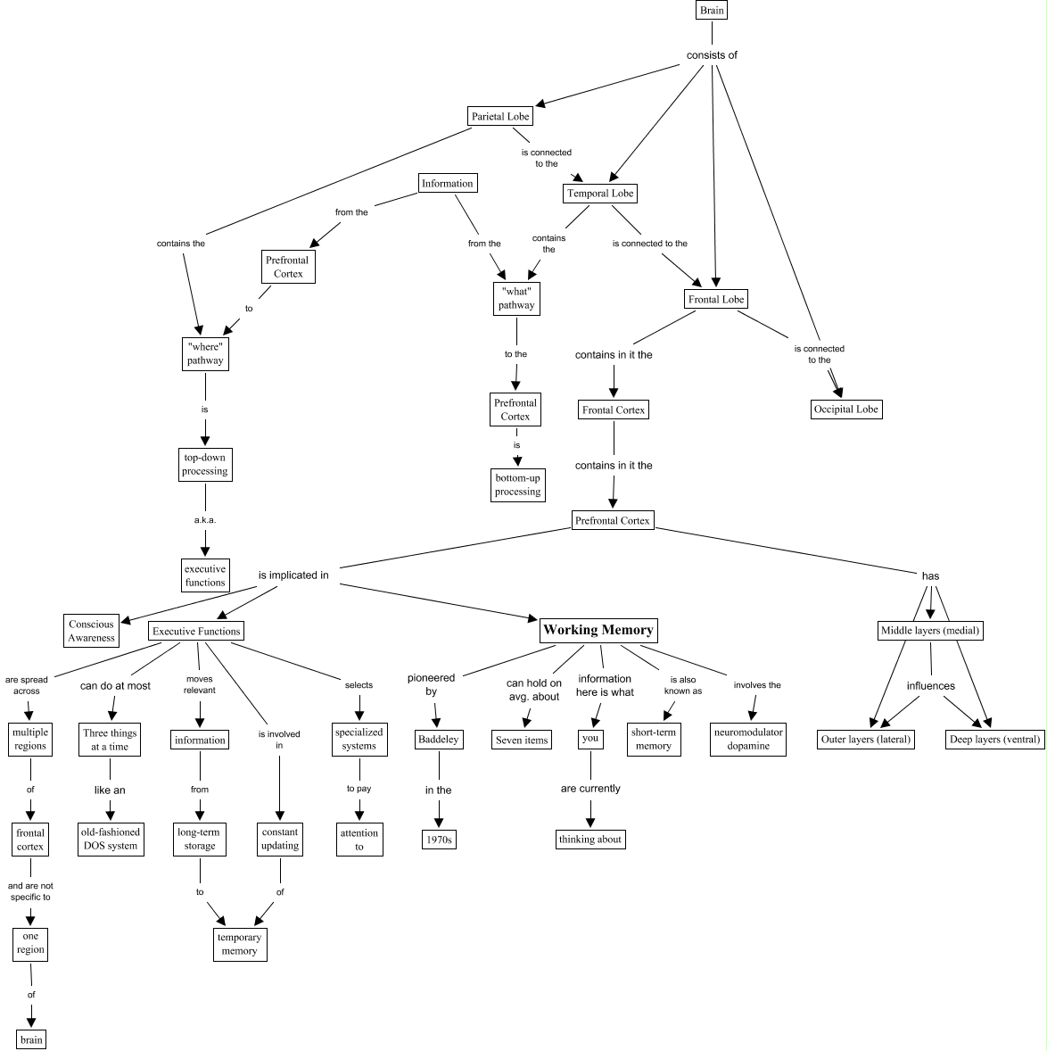 This Concept Map, created with IHMC CmapTools, has information related to: Working_Memory, Brain consists of Frontal Lobe, Three things at a time like an old-fashioned DOS system, information from long-term storage, Parietal Lobe is connected to the Temporal Lobe, long-term storage to temporary memory, Brain consists of Occipital Lobe, Middle layers (medial) influences Deep layers (ventral), Working Memory involves the neuromodulator dopamine, Parietal Lobe contains the "where" pathway, Frontal Lobe contains in it the Frontal Cortex, "what" pathway to the Prefrontal Cortex, constant updating of temporary memory, Working Memory can hold on avg. about Seven items, Prefrontal Cortex is implicated in Conscious Awareness, Executive Functions moves relevant information, Prefrontal Cortex to "where" pathway, Information from the "what" pathway, Executive Functions is involved in constant updating, Prefrontal Cortex has Deep layers (ventral), Information from the Prefrontal Cortex