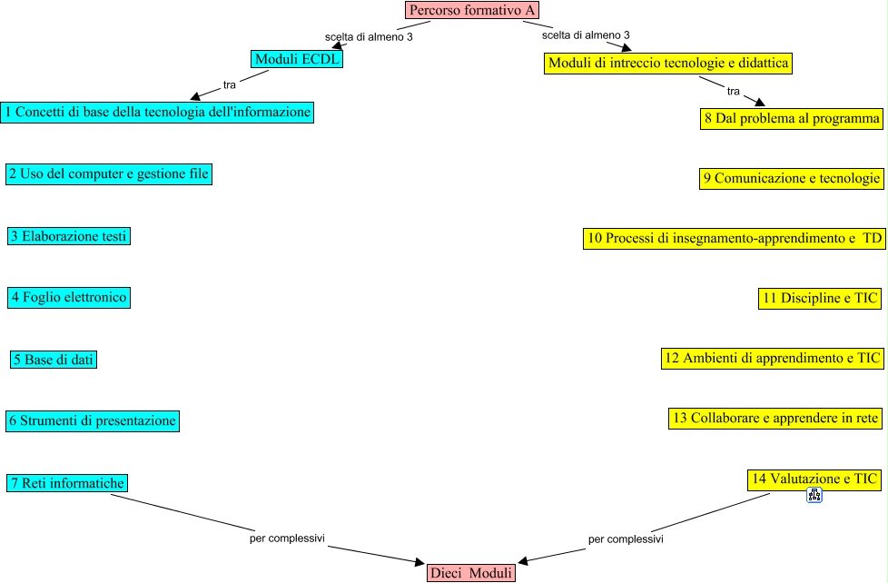 Questa Cmap, creata con IHMC CmapTools, contiene informazioni relative a: Percorso A, Moduli ECDL tra 1 Concetti di base della tecnologia dell'informazione, Moduli di intreccio tecnologie e didattica tra 8 Dal problema al programma, 7 Reti informatiche per complessivi Dieci Moduli, 14 Valutazione e TIC per complessivi Dieci Moduli, Percorso formativo A scelta di almeno 3 Moduli ECDL, Percorso formativo A scelta di almeno 3 Moduli di intreccio tecnologie e didattica