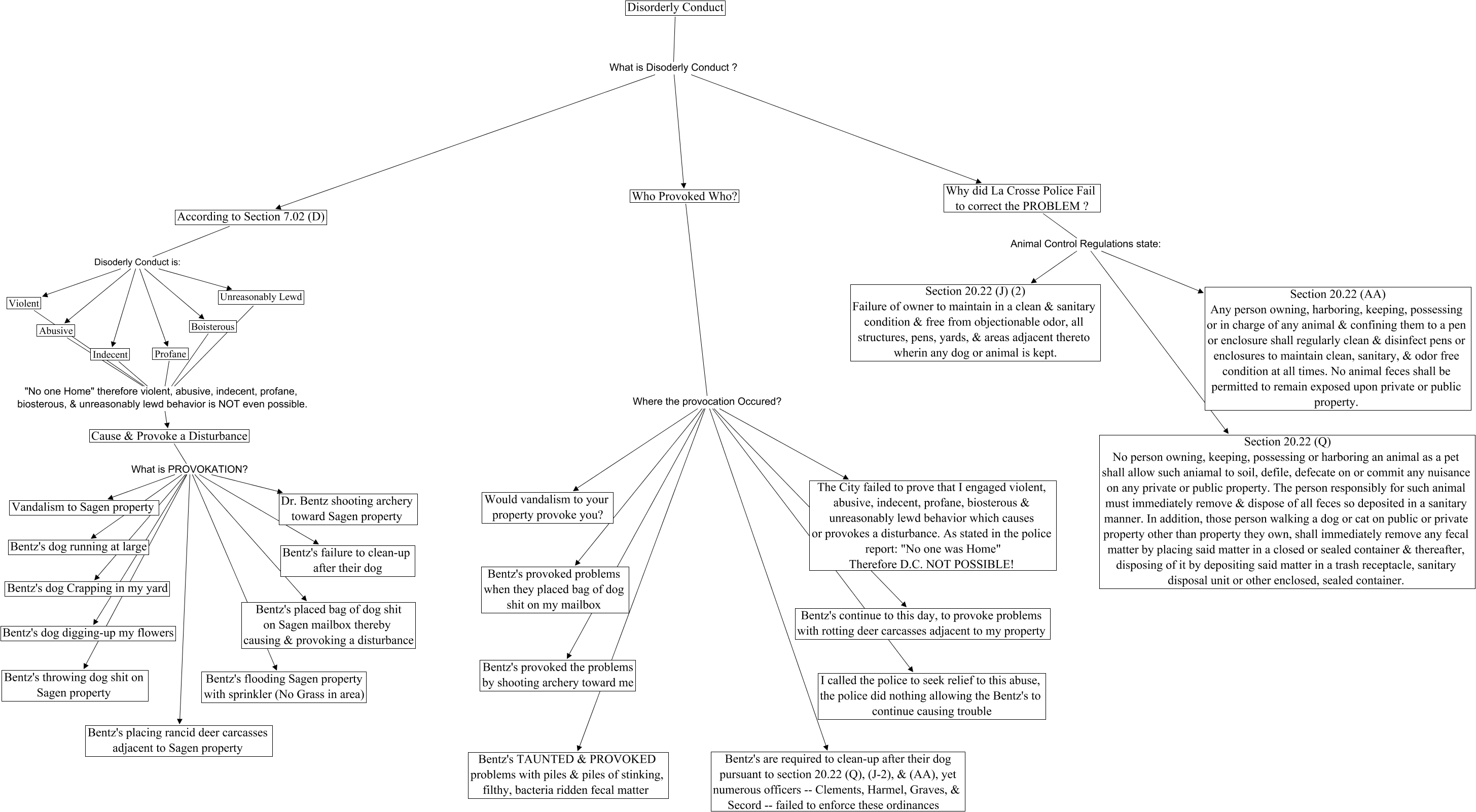 This Concept Map, created with IHMC CmapTools, has information related to: DoggyDoo, Boisterous "No one Home" therefore violent, abusive, indecent, profane, biosterous, & unreasonably lewd behavior is NOT even possible. Cause & Provoke a Disturbance, Unreasonably Lewd "No one Home" therefore violent, abusive, indecent, profane, biosterous, & unreasonably lewd behavior is NOT even possible. Cause & Provoke a Disturbance, Cause & Provoke a Disturbance What is PROVOKATION? Bentz's dog digging-up my flowers, Who Provoked Who? Where the provocation Occured? I called the police to seek relief to this abuse, the police did nothing allowing the Bentz's to continue causing trouble, Cause & Provoke a Disturbance What is PROVOKATION? Bentz's dog running at large, Profane "No one Home" therefore violent, abusive, indecent, profane, biosterous, & unreasonably lewd behavior is NOT even possible. Cause & Provoke a Disturbance, Indecent "No one Home" therefore violent, abusive, indecent, profane, biosterous, & unreasonably lewd behavior is NOT even possible. Cause & Provoke a Disturbance, Why did La Crosse Police Fail to correct the PROBLEM ? Animal Control Regulations state: Section 20.22 (J) (2) Failure of owner to maintain in a clean & sanitary condition & free from objectionable odor, all structures, pens, yards, & areas adjacent thereto wherin any dog or animal is kept., Cause & Provoke a Disturbance What is PROVOKATION? Bentz's placing rancid deer carcasses adjacent to Sagen property, Who Provoked Who? Where the provocation Occured? The City failed to prove that I engaged violent, abusive, indecent, profane, biosterous & unreasonably lewd behavior which causes or provokes a disturbance. As stated in the police report: "No one was Home" Therefore D.C. NOT POSSIBLE!, Disorderly Conduct What is Disoderly Conduct ? Why did La Crosse Police Fail to correct the PROBLEM ?, According to Section 7.02 (D) Disoderly Conduct is: Violent, Cause & Provoke a Disturbance What is PROVOKATION? Bentz's flooding Sagen property with sprinkler (No Grass in area), Who Provoked Who? Where the provocation Occured? Bentz's provoked the problems by shooting archery toward me, Who Provoked Who? Where the provocation Occured? Bentz's provoked problems when they placed bag of dog shit on my mailbox, Who Provoked Who? Where the provocation Occured? Would vandalism to your property provoke you?, Violent "No one Home" therefore violent, abusive, indecent, profane, biosterous, & unreasonably lewd behavior is NOT even possible. Cause & Provoke a Disturbance, According to Section 7.02 (D) Disoderly Conduct is: Unreasonably Lewd, According to Section 7.02 (D) Disoderly Conduct is: Abusive, Who Provoked Who? Where the provocation Occured? Bentz's are required to clean-up after their dog pursuant to section 20.22 (Q), (J-2), & (AA), yet numerous officers -- Clements, Harmel, Graves, & Secord -- failed to enforce these ordinances