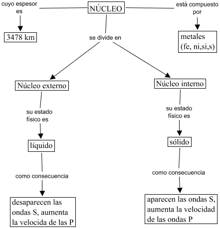 Este Cmap, tiene información relacionada con: Núcleo, NÚCLEO se divide en Núcleo interno, sólido como consecuencia aparecen las ondas S, aumenta la velocidad de las ondas P, Núcleo externo su estado físico es líquido, NÚCLEO está compuesto por metales (fe, ni,si,s), Núcleo interno su estado físico es sólido, NÚCLEO cuyo espesor es 3478 km, NÚCLEO se divide en Núcleo externo, líquido como consecuencia desaparecen las ondas S, aumenta la velocida de las P