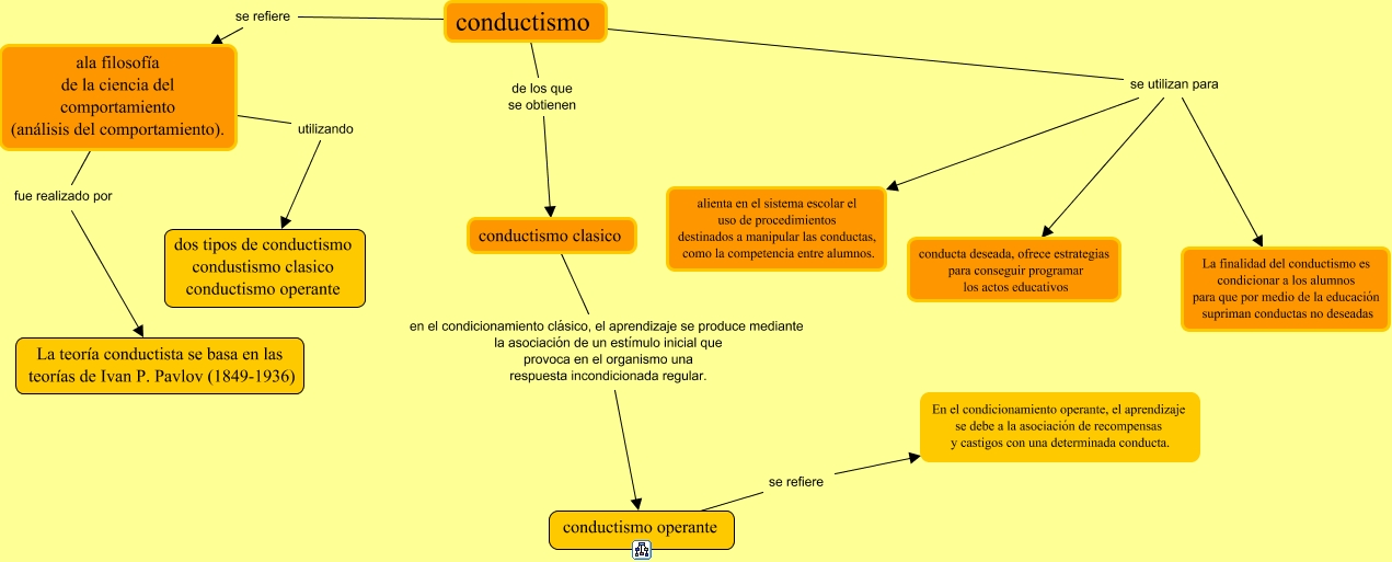 Este Cmap, tiene información relacionada con: Sondeos, conductismo se utilizan para La finalidad del conductismo es condicionar a los alumnos para que por medio de la educación supriman conductas no deseadas, conductismo clasico en el condicionamiento clásico, el aprendizaje se produce mediante la asociación de un estímulo inicial que provoca en el organismo una respuesta incondicionada regular. conductismo operante, conductismo operante se refiere En el condicionamiento operante, el aprendizaje se debe a la asociación de recompensas y castigos con una determinada conducta., ala filosofía de la ciencia del comportamiento (análisis del comportamiento). fue realizado por La teoría conductista se basa en las teorías de Ivan P. Pavlov (1849-1936), conductismo se utilizan para conducta deseada, ofrece estrategias para conseguir programar los actos educativos, conductismo de los que se obtienen conductismo clasico, conductismo se utilizan para alienta en el sistema escolar el uso de procedimientos destinados a manipular las conductas, como la competencia entre alumnos., ala filosofía de la ciencia del comportamiento (análisis del comportamiento). utilizando dos tipos de conductismo condustismo clasico conductismo operante, conductismo se refiere ala filosofía de la ciencia del comportamiento (análisis del comportamiento).