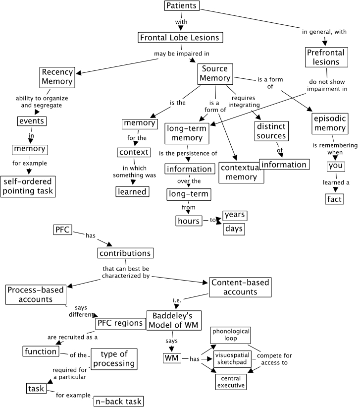 Ch12-2_3_24_2003_1338, context in which something was learned, events in memory, Recency Memory ability to organize and segregate events, Source Memory requires integrating distinct sources, type of processing required for a particular task, distinct sources of information, Content-based accounts i.e. Baddeley's Model of WM, memory for the context, PFC regions are recruited as a function, Prefrontal lesions do not show impairment in long-term memory