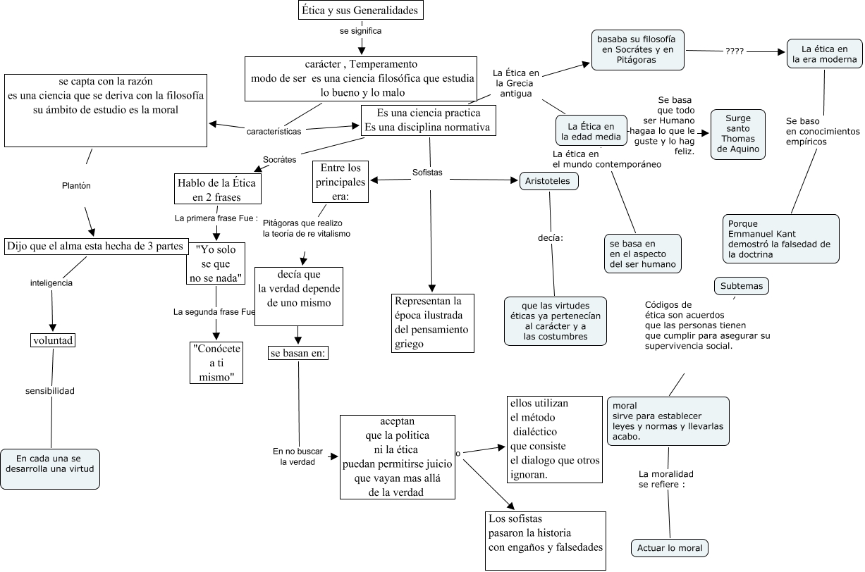 Este Cmap, tiene información relacionada con: Ch12-2_3_24_2003_1318, Es una ciencia practica Es una disciplina normativa La Ética en la Grecia antigua basaba su filosofía en Socrátes y en Pitágoras, Ética y sus Generalidades se significa carácter , Temperamento modo de ser es una ciencia filosófica que estudia lo bueno y lo malo, Es una ciencia practica Es una disciplina normativa Sofistas Entre los principales era:, Es una ciencia practica Es una disciplina normativa La Ética en la Grecia antigua La Ética en la edad media, aceptan que la politica ni la ética puedan permitirse juicio que vayan mas allá de la verdad to Los sofistas pasaron la historia con engaños y falsedades, Es una ciencia practica Es una disciplina normativa Sofistas Aristoteles, Es una ciencia practica Es una disciplina normativa Sofistas Representan la época ilustrada del pensamiento griego, decía que la verdad depende de uno mismo se basan en:, La ética en la era moderna Se baso en conocimientos empíricos Porque Emmanuel Kant demostró la falsedad de la doctrina, carácter , Temperamento modo de ser es una ciencia filosófica que estudia lo bueno y lo malo características se capta con la razón es una ciencia que se deriva con la filosofía su ámbito de estudio es la moral, Subtemas Códigos de ética son acuerdos que las personas tienen que cumplir para asegurar su supervivencia social. moral sirve para establecer leyes y normas y llevarlas acabo., La Ética en la edad media Se basa que todo ser Humano hagaa lo que le guste y lo hag feliz. Surge santo Thomas de Aquino, basaba su filosofía en Socrátes y en Pitágoras ???? La ética en la era moderna, Aristoteles decía: que las virtudes éticas ya pertenecían al carácter y a las costumbres, voluntad sensibilidad En cada una se desarrolla una virtud, Dijo que el alma esta hecha de 3 partes inteligencia voluntad, moral sirve para establecer leyes y normas y llevarlas acabo. La moralidad se refiere : Actuar lo moral, se capta con la razón es una ciencia que se deriva con la filosofía su ámbito de estudio es la moral Plantón Dijo que el alma esta hecha de 3 partes, La Ética en la edad media La ética en el mundo contemporáneo se basa en en el aspecto del ser humano, Es una ciencia practica Es una disciplina normativa Socrátes Hablo de la Ética en 2 frases