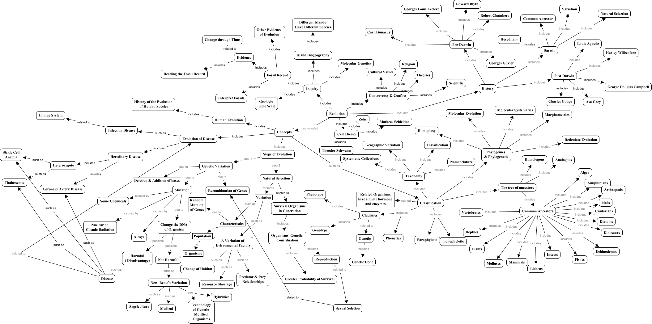 This Concept Map, created with IHMC CmapTools, has information related to: Evolution, Post-Darwin includes Haxley Wilbenfore, Controversy & Conflict includes Religion, Classification includes The tree of ancestors, Genetic Variation due to Recombination of Genes, Fossil Record includes Interpret Fossils, Organisms' Genetic Constituation includes Greater Probability of Survival, Classification includes Paraphyletic, Not Harmful such as New Benefit Variation, Pre-Darwin includes Georges Louis Leclerc, Fossil Record includes Other Evidence of Evolution, Darwin includes Common Ancestor, Classification includes Cladistics, Taxonomy includes Classification, Common Ancestors includes Reptiles, Evolution of Disease such as Infection Disease, Inquiry includes Island Biogeography, Disease such as Thalassemia, Common Ancestors includes Plants, History includes Post-Darwin, History includes Darwin