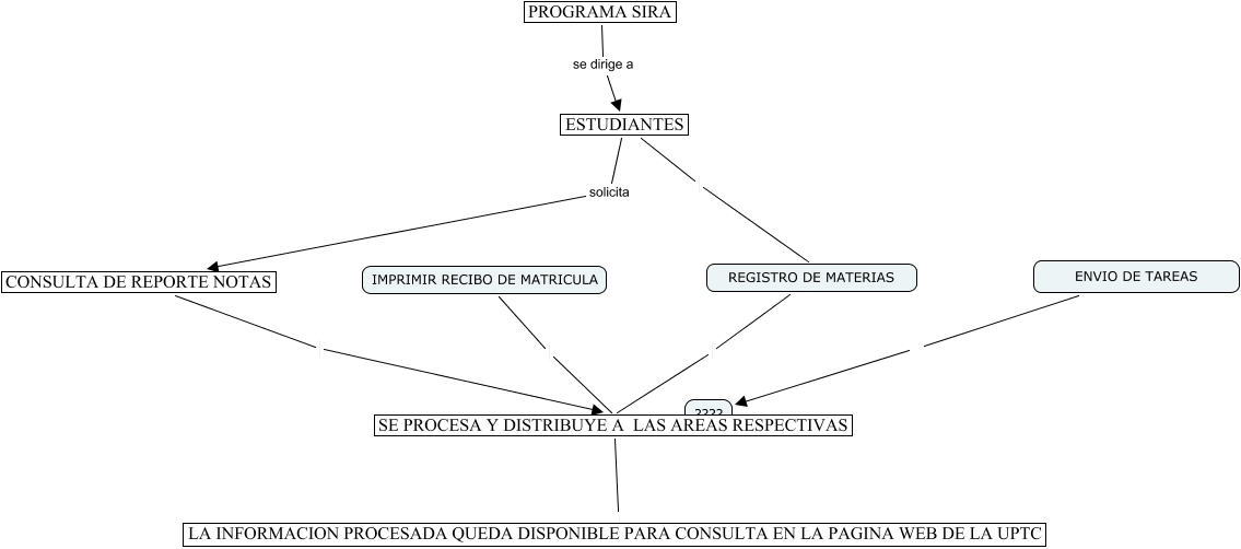 Este Cmap, tiene información relacionada con: actualizacion del curso, PROGRAMA SIRA se dirige a ESTUDIANTES, SE PROCESA Y DISTRIBUYE A LAS AREAS RESPECTIVAS LA INFORMACION PROCESADA QUEDA DISPONIBLE PARA CONSULTA EN LA PAGINA WEB DE LA UPTC, ESTUDIANTES solicita CONSULTA DE REPORTE NOTAS, CONSULTA DE REPORTE NOTAS SE PROCESA Y DISTRIBUYE A LAS AREAS RESPECTIVAS, ENVIO DE TAREAS ????, IMPRIMIR RECIBO DE MATRICULA SE PROCESA Y DISTRIBUYE A LAS AREAS RESPECTIVAS, ESTUDIANTES REGISTRO DE MATERIAS, REGISTRO DE MATERIAS SE PROCESA Y DISTRIBUYE A LAS AREAS RESPECTIVAS