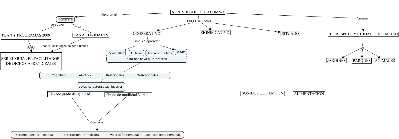 Este Cmap, tiene información relacionada con: OBJETIVOS, COOPERATIVO implica aprender A Ser, APRENDIZAJE DEL ALUMNO PUEDE UTILIZAR SITUADO, PLAN Y PROGRAMAS 2009 PARA SER EL GUIA , EL FACILITADOR DE DICHOS APRENDIZAJES, Elevado grado de igualdad Compone Interdependecncia Positiva Interaccion Promocianal Valoraciòn Personal o Responsabilidad Personal, DOCENTE Crea LAS ACTIVIDADES, Cognitivo Afectivo Relacionales Motivacionales cuyas caracteristicas llevan a, EL RESPETO Y CUIDADO DEL MEDIO de PARQUES, DOCENTE se apoya ????, APRENDIZAJE DEL ALUMNO influye en el DOCENTE, Grado de mutilidad Variable Compone Interdependecncia Positiva Interaccion Promocianal Valoraciòn Personal o Responsabilidad Personal, APRENDIZAJE DEL ALUMNO PUEDE UTILIZAR SIGNIFICATIVO, COOPERATIVO implica aprender A Conocer, COOPERATIVO implica aprender A vivir con otros, APRENDIZAJE DEL ALUMNO fomentar EL RESPETO Y CUIDADO DEL MEDIO, EL RESPETO Y CUIDADO DEL MEDIO de ANIMALES, esto nos lleva a un proceso ???? Cognitivo Afectivo Relacionales Motivacionales, LAS ACTIVIDADES sobre los interese de sus alumnos SER EL GUIA , EL FACILITADOR DE DICHOS APRENDIZAJES, EL RESPETO Y CUIDADO DEL MEDIO de JARDINES, APRENDIZAJE DEL ALUMNO PUEDE UTILIZAR COOPERATIVO, COOPERATIVO implica aprender A Hacer