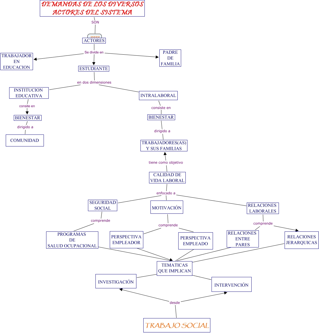Este Cmap, tiene información relacionada con: Empresas y Organizaciones, INTRALABORAL consiste en BIENESTAR, ACTORES Se divide en TRABAJADOR EN EDUCACION, PERSPECTIVA EMPLEADO ???? TEMATICAS QUE IMPLICAN, TEMATICAS QUE IMPLICAN ???? PROGRAMAS DE SALUD OCUPACIONAL, SEGURIDAD SOCIAL comprende PROGRAMAS DE SALUD OCUPACIONAL, RELACIONES JERARQUICAS ???? TEMATICAS QUE IMPLICAN, DEMANDAS DE LOS DIVERSOS ACTORES DEL SISTEMA SON ????, TRABAJO SOCIAL desde INTERVENCIÓN, ACTORES Se divide en ESTUDIANTE, INTERVENCIÓN ???? TEMATICAS QUE IMPLICAN, INSTITUCION EDUCATIVA consite en BIENESTAR, TRABAJO SOCIAL desde INVESTIGACIÓN, ACTORES Se divide en PADRE DE FAMILIA, RELACIONES LABORALES comprende RELACIONES JERARQUICAS, RELACIONES ENTRE PARES comprende RELACIONES JERARQUICAS, PERSPECTIVA EMPLEADOR ???? TEMATICAS QUE IMPLICAN, CALIDAD DE VIDA LABORAL tiene como objetivo TRABAJADORES(AS) Y SUS FAMILIAS