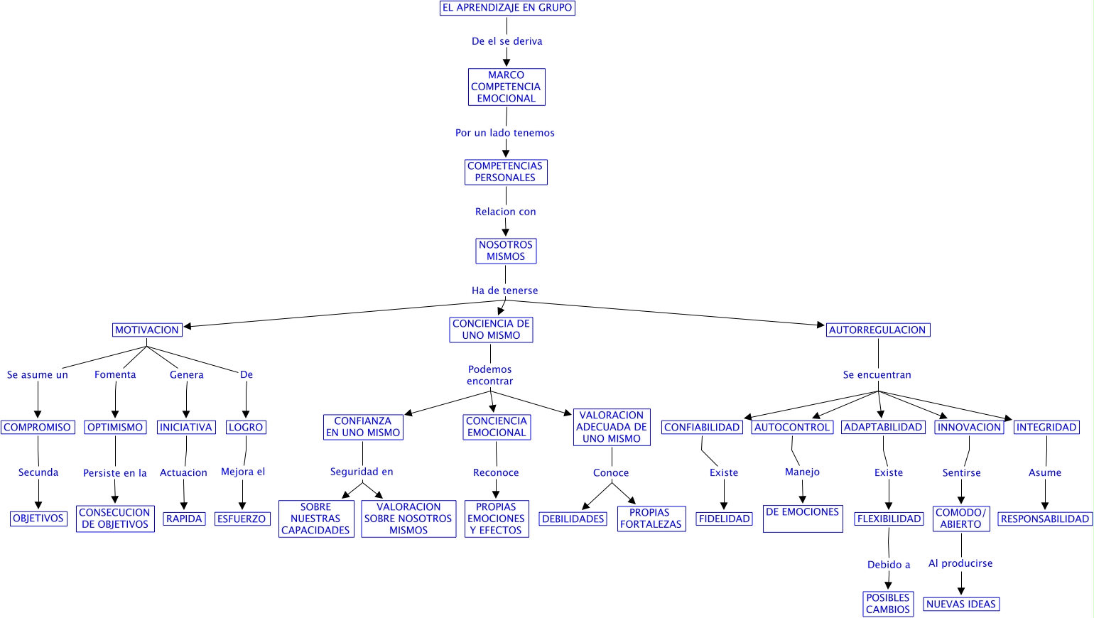El Aprendizaje en grupo 2, CONFIANZA EN UNO MISMO Seguridad en VALORACION SOBRE NOSOTROS MISMOS, EL APRENDIZAJE EN GRUPO De el se deriva MARCO COMPETENCIA EMOCIONAL, MARCO COMPETENCIA EMOCIONAL Por un lado tenemos COMPETENCIAS PERSONALES, CONCIENCIA EMOCIONAL Reconoce PROPIAS EMOCIONES Y EFECTOS, AUTORREGULACION Se encuentran AUTOCONTROL, CONFIANZA EN UNO MISMO Seguridad en SOBRE NUESTRAS CAPACIDADES, MOTIVACION Fomenta OPTIMISMO, COMPETENCIAS PERSONALES Relacion con NOSOTROS MISMOS, AUTORREGULACION Se encuentran INTEGRIDAD, AUTORREGULACION Se encuentran CONFIABILIDAD