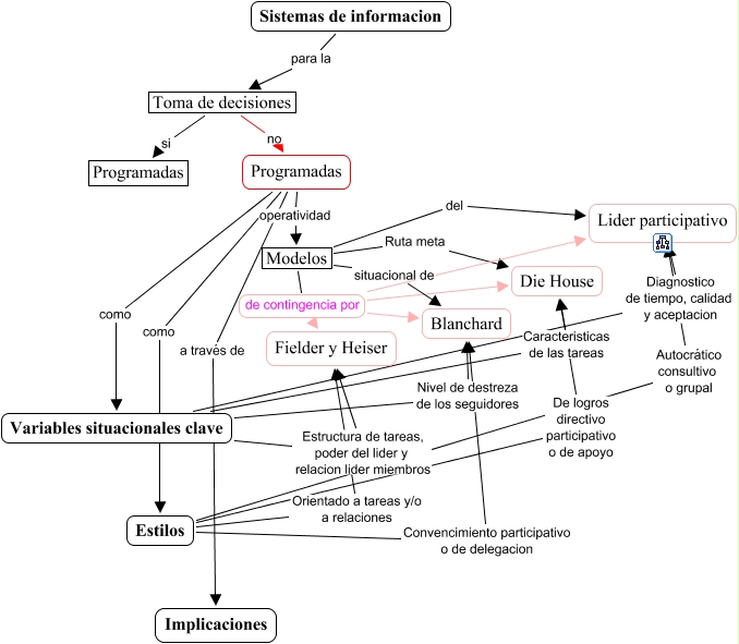 Este Cmap, tiene información relacionada con: sisinfo, Variables situacionales clave Nivel de destreza de los seguidores Blanchard, Estilos De logros directivo participativo o de apoyo Die House, Estilos Orientado a tareas y/o a relaciones Fielder y Heiser, Variables situacionales clave Estructura de tareas, poder del lider y relacion lider miembros Fielder y Heiser, Estilos Convencimiento participativo o de delegacion Blanchard, Toma de decisiones si Programadas, Variables situacionales clave Diagnostico de tiempo, calidad y aceptacion Lider participativo, Programadas como Variables situacionales clave, Variables situacionales clave Caracteristicas de las tareas Die House, Estilos Autocrático consultivo o grupal Lider participativo, Sistemas de informacion para la Toma de decisiones, Modelos del Lider participativo, Modelos de contingencia por Lider participativo, Modelos de contingencia por Die House, Modelos de contingencia por Fielder y Heiser, Programadas operatividad Modelos, Toma de decisiones no Programadas, Programadas a través de Implicaciones, Programadas como Estilos, Modelos de contingencia por Blanchard