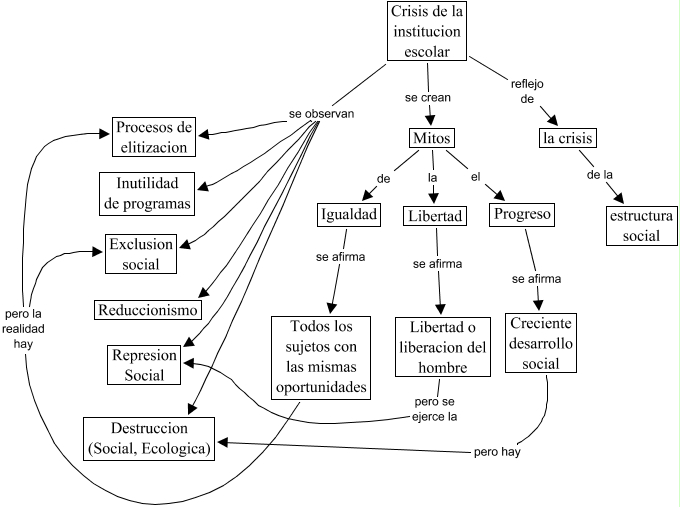 Esse mapa conceitual, produzido no IHMC CmapTools, tem a informação relacionada a: Crisis de la Educacion, Crisis de la institucion escolar se observan Inutilidad de programas, Crisis de la institucion escolar reflejo de la crisis, Igualdad se afirma Todos los sujetos con las mismas oportunidades, Mitos de Igualdad, Mitos la Libertad, Crisis de la institucion escolar se observan Reduccionismo, Crisis de la institucion escolar se observan Procesos de elitizacion, Progreso se afirma Creciente desarrollo social, Creciente desarrollo social pero hay Destruccion (Social, Ecologica), Libertad o liberacion del hombre pero se ejerce la Represion Social, Crisis de la institucion escolar se observan Represion Social, Crisis de la institucion escolar se observan Destruccion (Social, Ecologica), Mitos el Progreso, Todos los sujetos con las mismas oportunidades pero la realidad hay Procesos de elitizacion, la crisis de la estructura social, Libertad se afirma Libertad o liberacion del hombre, Todos los sujetos con las mismas oportunidades pero la realidad hay Exclusion social, Crisis de la institucion escolar se observan Exclusion social, Crisis de la institucion escolar se crean Mitos