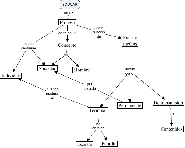 Este Cmap, tiene información relacionada con: ¿Que es educar_, Proceso parte de un Concepto, Terminal cuando madura el Individuo, De transmision de Contenidos, Terminal por obra de Familia, Fines y medios puede ser o Terminal, Permanente por obra de Sociedad, Proceso puede centrarse Individuo, Concepto de Sociedad, Proceso puede centrarse Sociedad, EDUCAR es un Proceso, Concepto de Hombre, Terminal por obra de Escuela, Fines y medios puede ser o Permanente, Fines y medios puede ser o De transmision, Proceso que en funcion de Fines y medios
