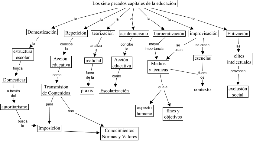 Este Cmap, tiene información relacionada con: Los siete pecados capitales en educacion, Repetición concibe la Acción educativa, Los siete pecados capitales de la educación la Elitización, academicismo concibe la Acción educativa, Acción educativa como Transmisión de Contenidos, estructura escolar busca Domesticar, Medios y técnicas que a aspecto humano, escuelas fuera de contexto, burocratización mayor importancia Medios y técnicas, Los siete pecados capitales de la educación el academicismo, Los siete pecados capitales de la educación la teorización, improvisación se usan Medios y técnicas, Medios y técnicas que a fines y objetivos, Domesticar a través del autoritarismo, Imposición de Conocimientos Normas y Valores, Transmisión de Contenidos son Conocimientos Normas y Valores, Los siete pecados capitales de la educación la Domesticación, Los siete pecados capitales de la educación la improvisación, Elitización las elites intelectuales, elites intelectuales provocan exclusión social, autoritarismo busca la Imposición
