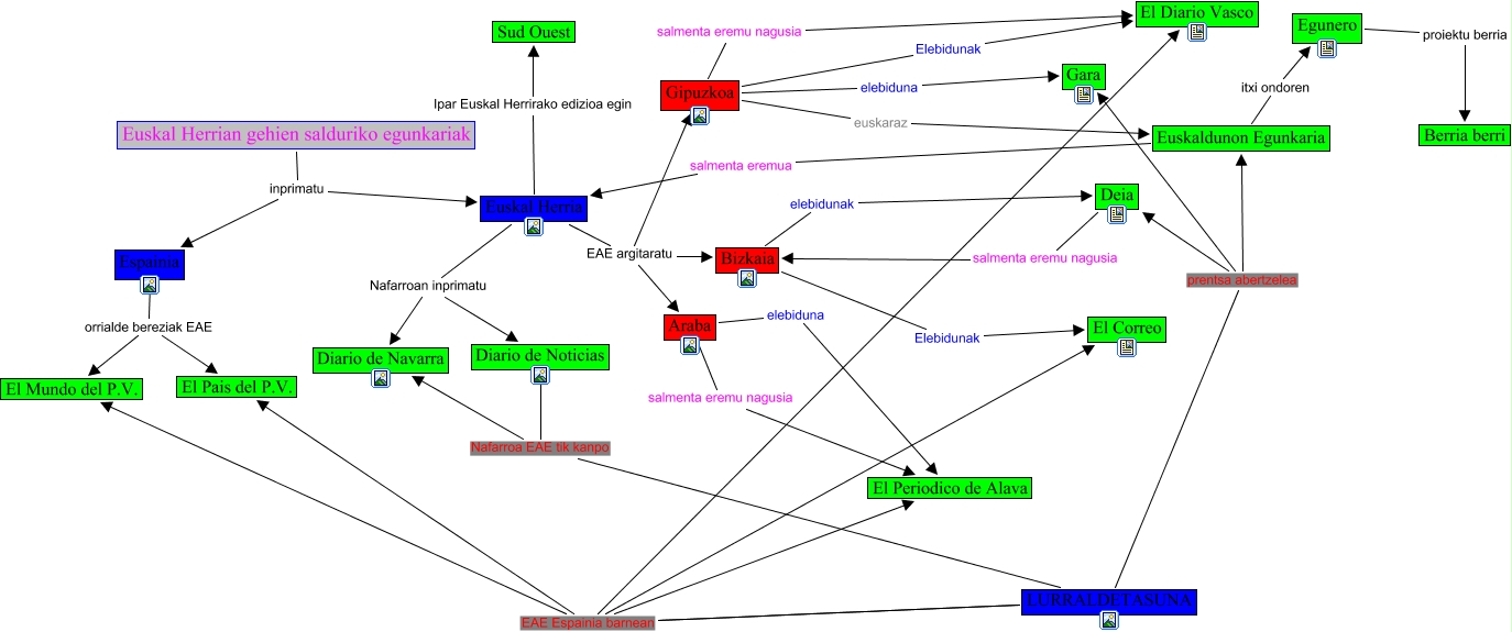 Este Cmap, tiene información relacionada con: egunkariak, Bizkaia elebidunak Deia, LURRALDETASUNA Nafarroa EAE tik kanpo Diario de Noticias, Bizkaia Elebidunak El Correo, Euskal Herrian gehien salduriko egunkariak inprimatu Espainia, LURRALDETASUNA EAE Espainia barnean El Periodico de Alava, Espainia orrialde bereziak EAE El Mundo del P.V., Euskal Herrian gehien salduriko egunkariak inprimatu Euskal Herria, LURRALDETASUNA prentsa abertzelea Gara, LURRALDETASUNA EAE Espainia barnean El Diario Vasco, Gipuzkoa euskaraz Euskaldunon Egunkaria, LURRALDETASUNA EAE Espainia barnean El Mundo del P.V., Euskal Herria Ipar Euskal Herrirako edizioa egin Sud Ouest, Espainia orrialde bereziak EAE El Pais del P.V., LURRALDETASUNA EAE Espainia barnean El Diario Vasco, LURRALDETASUNA EAE Espainia barnean El Correo, Araba salmenta eremu nagusia El Periodico de Alava, Euskal Herria EAE argitaratu Bizkaia, LURRALDETASUNA EAE Espainia barnean El Pais del P.V., Euskal Herria Nafarroan inprimatu Diario de Noticias, Gipuzkoa salmenta eremu nagusia El Diario Vasco
