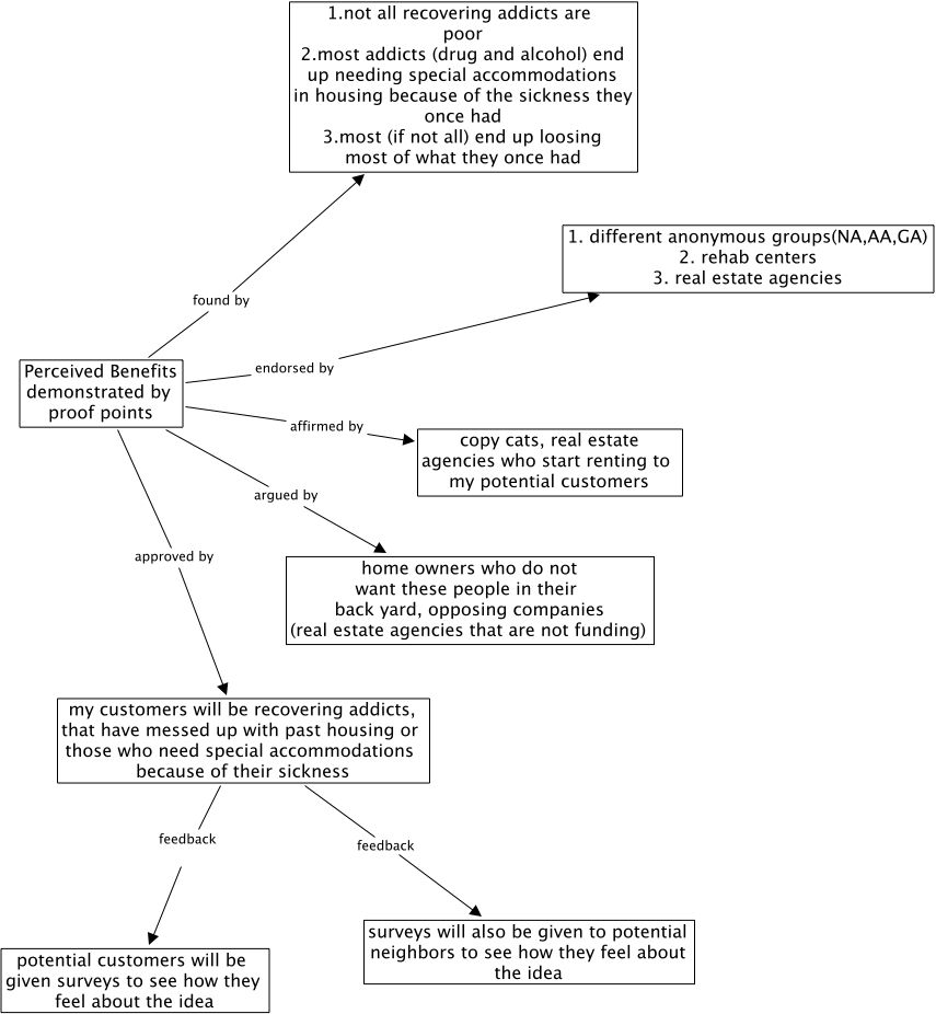 ETR3, Perceived Benefits demonstrated by proof points found by 1.not all recovering addicts are poor 2.most addicts (drug and alcohol) end up needing special accommodations in housing because of the sickness they once had 3.most (if not all) end up loosing most of what they once had, Perceived Benefits demonstrated by proof points approved by my customers will be recovering addicts, that have messed up with past housing or those who need special accommodations because of their sickness, Perceived Benefits demonstrated by proof points argued by home owners who do not want these people in their back yard, opposing companies (real estate agencies that are not funding), Perceived Benefits demonstrated by proof points endorsed by 1. different anonymous groups(NA,AA,GA) 2. rehab centers 3. real estate agencies, my customers will be recovering addicts, that have messed up with past housing or those who need special accommodations because of their sickness feedback potential customers will be given surveys to see how they feel about the idea, my customers will be recovering addicts, that have messed up with past housing or those who need special accommodations because of their sickness feedback surveys will also be given to potential neighbors to see how they feel about the idea, Perceived Benefits demonstrated by proof points affirmed by copy cats, real estate agencies who start renting to my potential customers