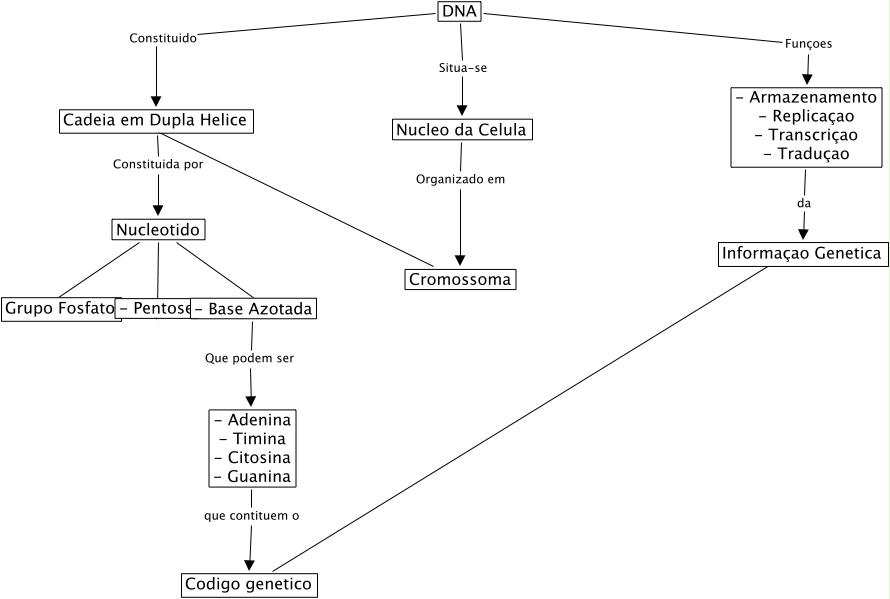 DNAMAP, DNA Situa-se Nucleo da Celula, Nucleotido - Pentose, Nucleotido Grupo Fosfato, Codigo genetico Informaçao Genetica, - Adenina - Timina - Citosina - Guanina que contituem o Codigo genetico, Cadeia em Dupla Helice Constituida por Nucleotido, Nucleo da Celula Organizado em Cromossoma, DNA Funçoes - Armazenamento - Replicaçao - Transcriçao - Traduçao, DNA Constituido Cadeia em Dupla Helice, - Base Azotada Que podem ser - Adenina - Timina - Citosina - Guanina