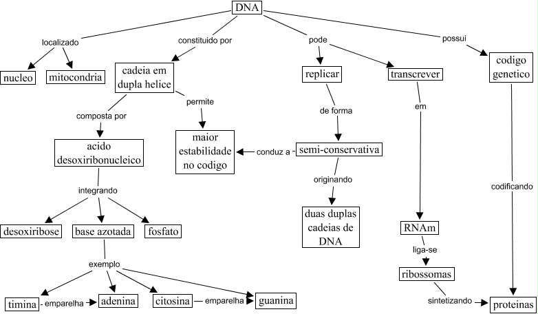 Este Cmap, tiene información relacionada con: DNA-jcf, transcrever em RNAm, DNA possui codigo genetico, timina emparelha adenina, acido desoxiribonucleico integrando desoxiribose, DNA constituido por cadeia em dupla helice, acido desoxiribonucleico integrando base azotada, base azotada exemplo adenina, base azotada exemplo timina, ribossomas sintetizando proteinas, cadeia em dupla helice composta por acido desoxiribonucleico, semi-conservativa conduz a maior estabilidade no codigo, acido desoxiribonucleico integrando fosfato, DNA pode transcrever, DNA localizado mitocondria, DNA localizado nucleo, citosina emparelha guanina, codigo genetico codificando proteinas, base azotada exemplo guanina, base azotada exemplo citosina, replicar de forma semi-conservativa