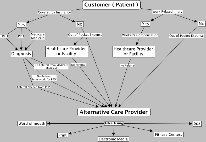 AlternativeCare, Alternative Care Provider Advertising Spa, Diagnosis No Referral from Medicare Medicaid Alternative Care Provider, Alternative Care Provider Advertising Electronic Media, Healthcare Provider or Facility No Referral Alternative Care Provider, Customer ( Patient ) Work Related Injury Yes, Alternative Care Provider Advertising Fitness Centers, Yes HMO Diagnosis, Customer ( Patient ) Covered by Insurance Yes, Alternative Care Provider Advertising Word of mouth, Healthcare Provider or Facility No Referral Alternative Care Provider