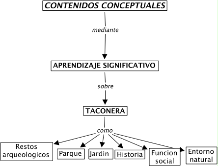 Contenidos conceptuales, TACONERA como Restos arqueologicos, TACONERA como Entorno natural, APRENDIZAJE SIGNIFICATIVO sobre TACONERA, TACONERA como Parque, TACONERA como Funcion social, CONTENIDOS CONCEPTUALES mediante APRENDIZAJE SIGNIFICATIVO, TACONERA como Jardin, TACONERA como Historia