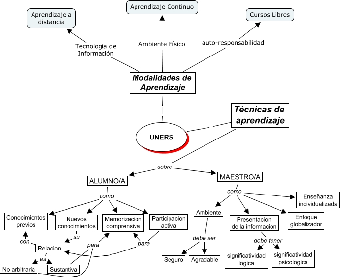 Este Cmap, tiene información relacionada con: Metodologia, Modalidades de Aprendizaje auto-responsabilidad Cursos Libres, Relacion es Sustantiva, ALUMNO/A como Memorizacion comprensiva, ALUMNO/A como Conocimientos previos, MAESTRO/A como Enseñanza individualizada, Relacion es No arbitraria, Presentacion de la informacion debe tener significatividad logica, MAESTRO/A como Enfoque globalizador, Modalidades de Aprendizaje Ambiente Físico Aprendizaje Continuo, MAESTRO/A como Ambiente, Ambiente debe ser Seguro, Técnicas de aprendizaje sobre ALUMNO/A, Nuevos conocimientos su Relacion, Presentacion de la informacion debe tener significatividad psicologica, ALUMNO/A como Nuevos conocimientos, Modalidades de Aprendizaje Tecnologia de Información Aprendizaje a distancia, MAESTRO/A como Presentacion de la informacion, Participacion activa para Relacion, Ambiente debe ser Agradable, Participacion activa para Memorizacion comprensiva