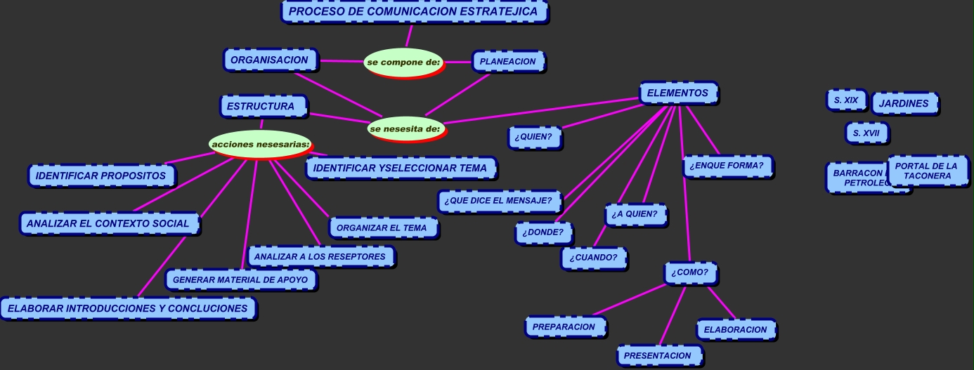 Este Cmap, tiene información relacionada con: EVOLUCION HISTORICA, ELABORAR INTRODUCCIONES Y CONCLUCIONES acciones nesesarias: ESTRUCTURA, ESTRUCTURA se nesesita de: PLANEACION, ELEMENTOS se nesesita de: PLANEACION, ANALIZAR EL CONTEXTO SOCIAL acciones nesesarias: ESTRUCTURA, ANALIZAR A LOS RESEPTORES acciones nesesarias: ESTRUCTURA, ¿ENQUE FORMA? ???? ELEMENTOS, ORGANIZAR EL TEMA acciones nesesarias: IDENTIFICAR YSELECCIONAR TEMA, ANALIZAR A LOS RESEPTORES acciones nesesarias: IDENTIFICAR PROPOSITOS, ORGANIZAR EL TEMA acciones nesesarias: ESTRUCTURA, ¿A QUIEN? ???? ELEMENTOS, ¿DONDE? ???? ELEMENTOS, ORGANIZAR EL TEMA acciones nesesarias: IDENTIFICAR PROPOSITOS, PRESENTACION ???? ¿COMO?, PLANEACION se compone de: PROCESO DE COMUNICACION ESTRATEJICA, ELABORAR INTRODUCCIONES Y CONCLUCIONES acciones nesesarias: IDENTIFICAR YSELECCIONAR TEMA, GENERAR MATERIAL DE APOYO acciones nesesarias: IDENTIFICAR YSELECCIONAR TEMA, ELEMENTOS se nesesita de: ORGANISACION, GENERAR MATERIAL DE APOYO acciones nesesarias: IDENTIFICAR PROPOSITOS, ANALIZAR A LOS RESEPTORES acciones nesesarias: IDENTIFICAR YSELECCIONAR TEMA, ¿CUANDO? ???? ELEMENTOS